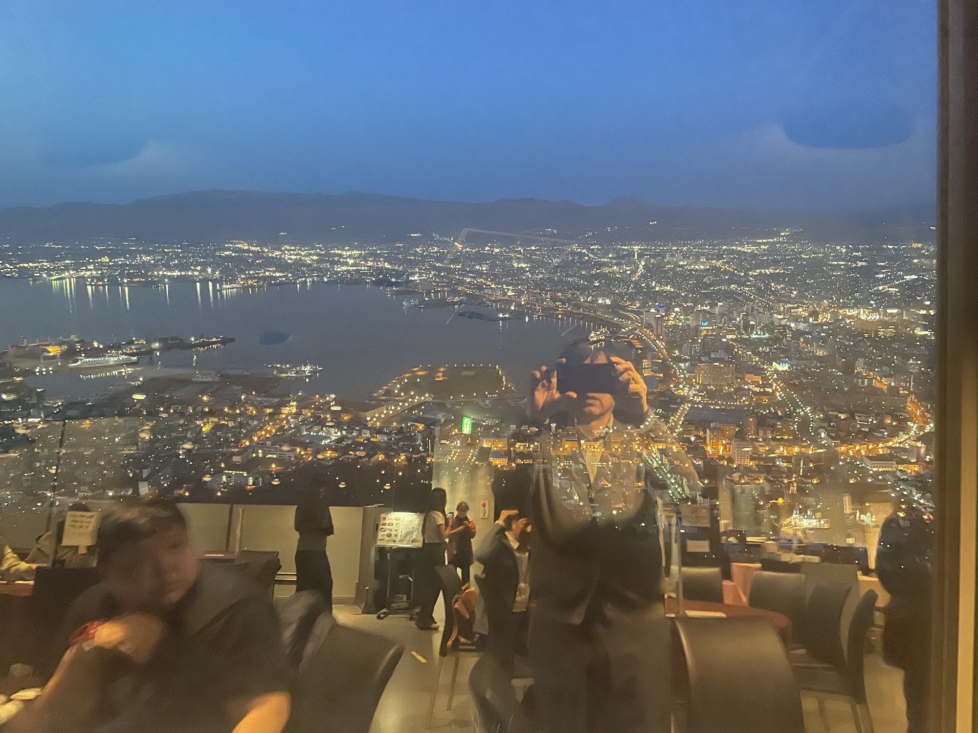 箱館山の夜はかなり混んでいます。2階のレストランからも外と同じくらいきれいな眺望が見られますので、お子様やお年寄りが一緒のときはレストランに入った方が良いかもしれません。