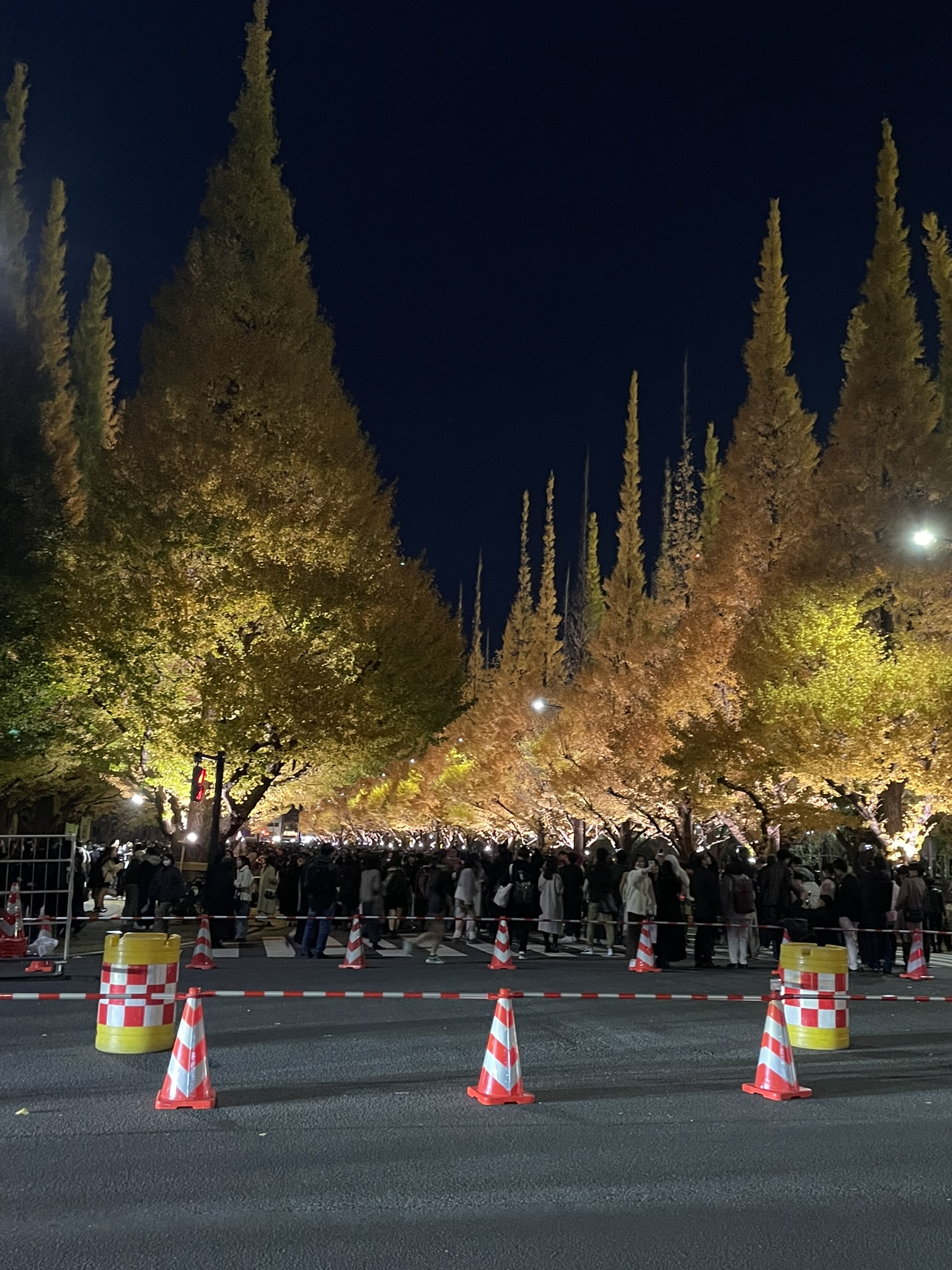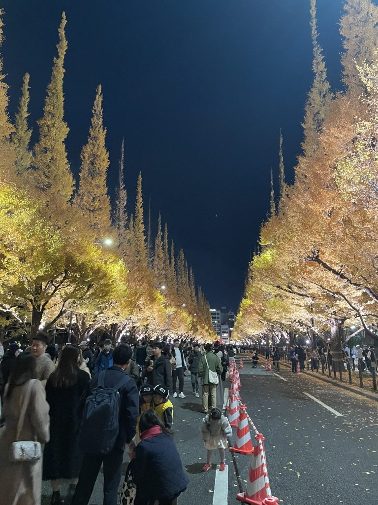 昼間のイチョウ並木がすばらしかったので、クリスマスマーケットの帰りにライトアップされたイチョウ並木を見に行きました。