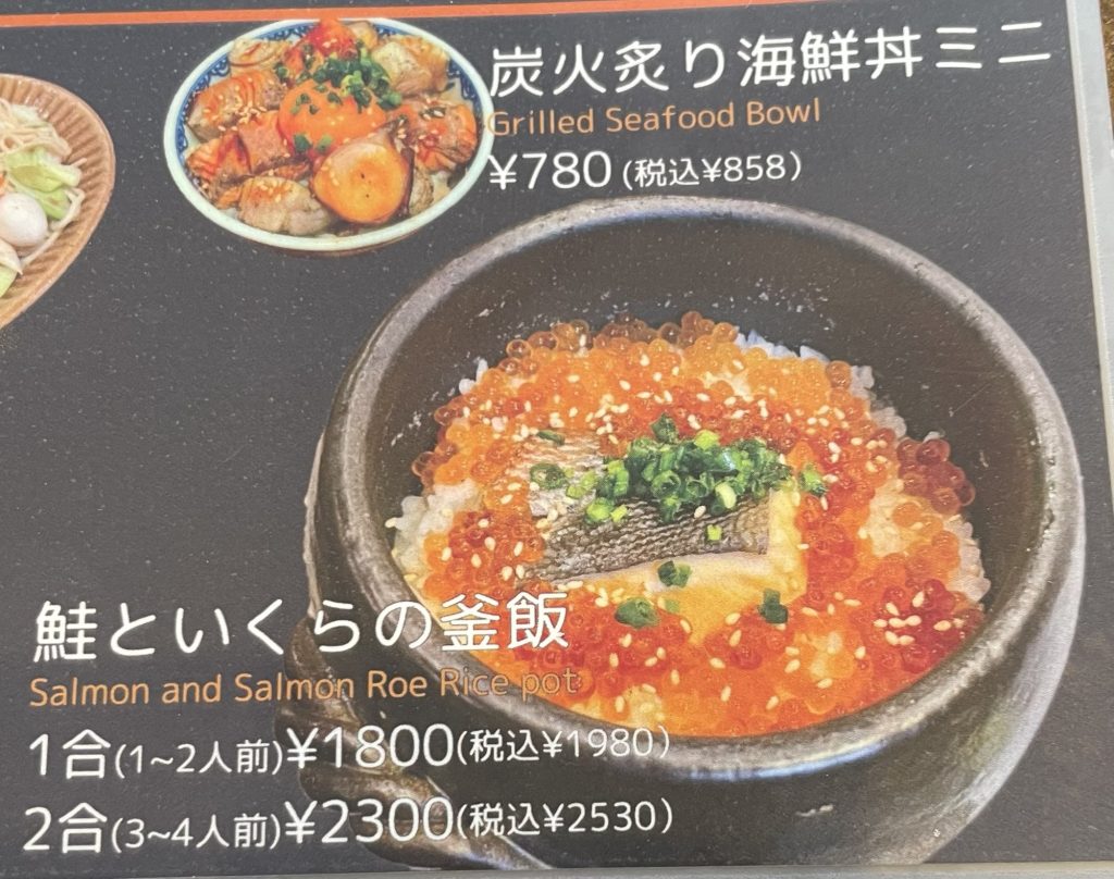 (感想)「鮭といくらの釜飯」がとても美味しかったです。注文を受けてから土釜で炊くので30分くらいかかりますが待つ価値があります。店員さんもとても親切でした。値段もお手頃だと思います。