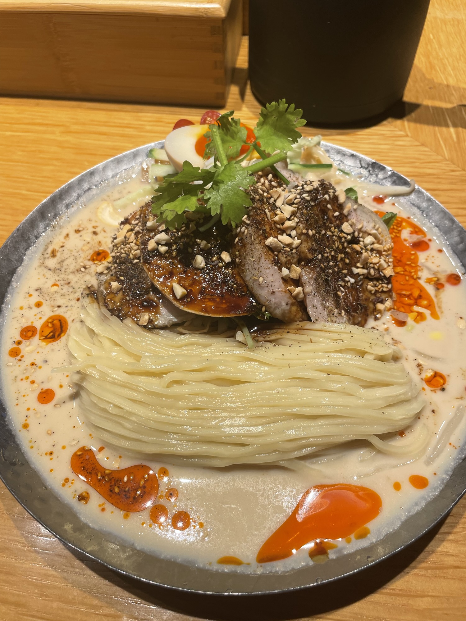 九段北にある「二階堂」は、夏限定の「よだれ鶏豆乳冷やし担々麺」で評判のお店です。滑らかな豆乳ベースのスープはピリ辛で、ストレート麺にしっかり絡みます。トッピングにはジューシーなよだれ鶏やパクチー、豆もやし、ミニトマトなど彩り豊かな具材が満載。さらにピーナッツとゴマの香ばしいアクセントが味わいを引き立てます。